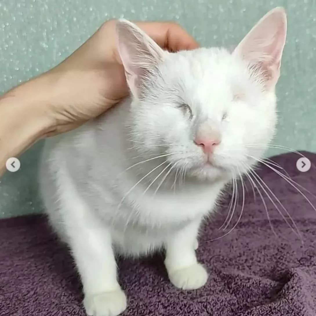 Если вы решили изменить , что-то в этом мире к лучшему, то возьмите в приюте особенного котёнка. Белочек ласковый толстячок. Чудесный котёнок. Он добрый мурчун, которому очень не повезло в жизни. Жил под подъездом, заболел, потерял глазик. Одноглазым тяжело на улице. Потом кто-то его искалечил и выбил ему второй и единственный зрячий глаз. После операции Белочек живёт в приюте. Котёнок немного боится чужих людей. Со своими ласков, с радостью, контактирует, любит, что бы его чесали и гладили. Мурчит, как мини трактор. Очень милый мальчик. Как показывает практика, котики без глаз в течении недели привыкают к квартире. А потом Вы не отличите зрячего котика от незрячего. Для людей отсутствие зрения - это инвалидность, беда. Для котика-это маленький недостаток в комфортности передвижения в незнакомом пространстве и не более. Котик не чувствует своей неполноценности. У него есть слух, осязание, обоняние и большая потребность быть нужным и любимым. Приют пристроил в семьи более десятка незрячих котиков и одну собаку. Все хозяева очень довольны ими. Отличий от зрячих животных НЕТ. Белочек замечательный и очень красивый мальчик. Он вырастет крупным котиком с шелковистой белоснежной шубкой и добрым сердцем! Очень чистоплотен и приучен к лотку с наполнителем Кастрирован Кушает сухой корм От блох и от глистов обработан