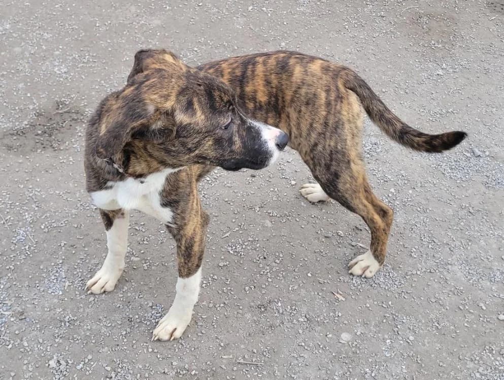 Beryl fait partie d’une portée de sept petits que nous avons recueillis et placés en fourrière après qu’ils aient été secourus par les pompiers, des bénévoles et une association locale, suite à plusieurs jours passés dehors dans le froid au début du mois de mars. Toute cette petite tribu est un croisement entre dogue et berger, bien que nous ne connaissions pas précisément leur mélange. Ils ont tous un très bon cœur et une bouille adorable, mais il sera indispensable de leur offrir des cours d’éducation avec un professionnel, car ils n’ont pas encore eu beaucoup d’expériences ni de repères.