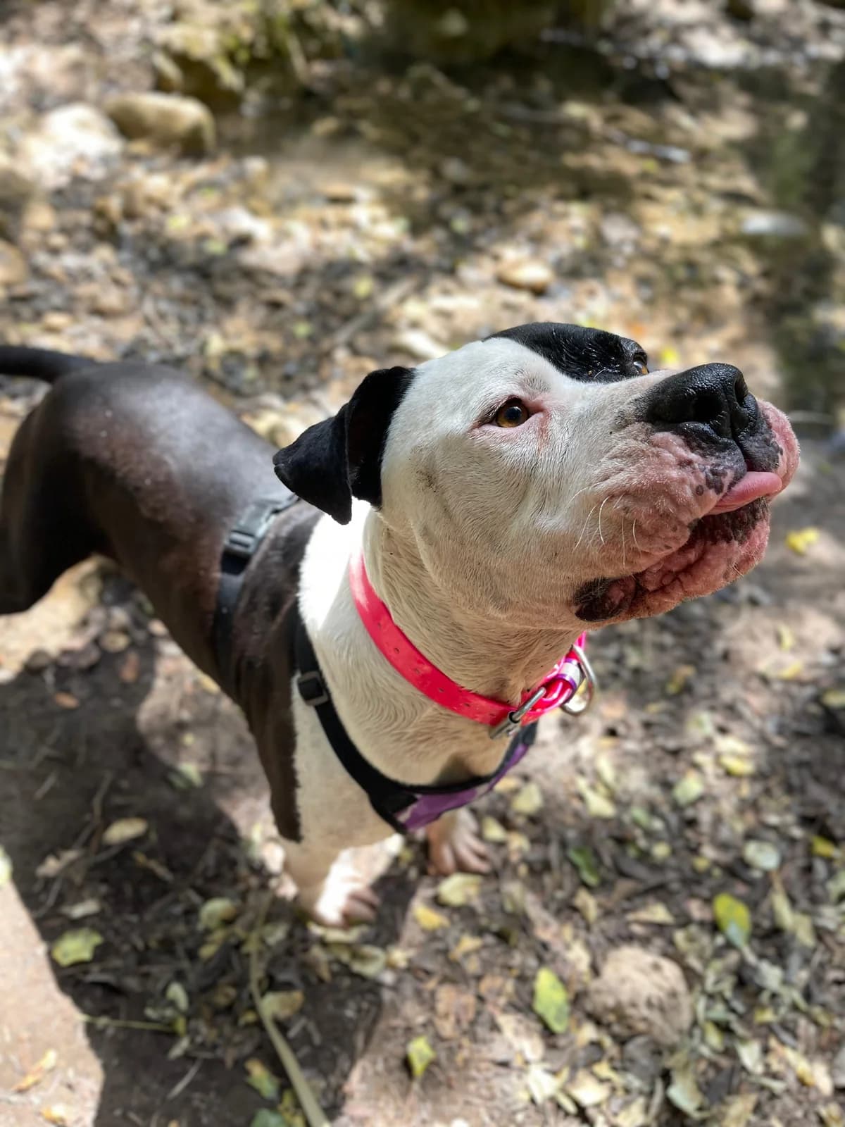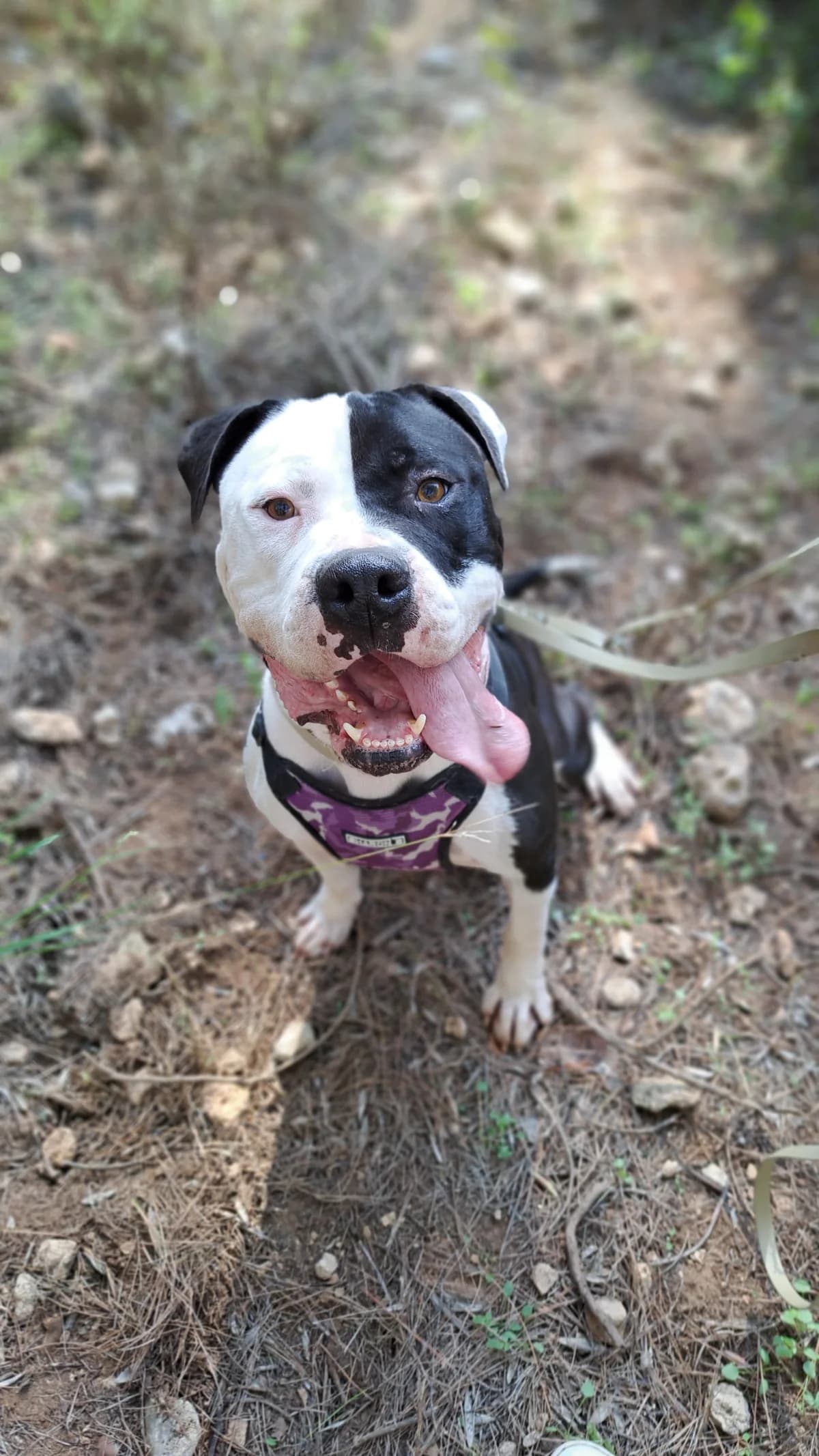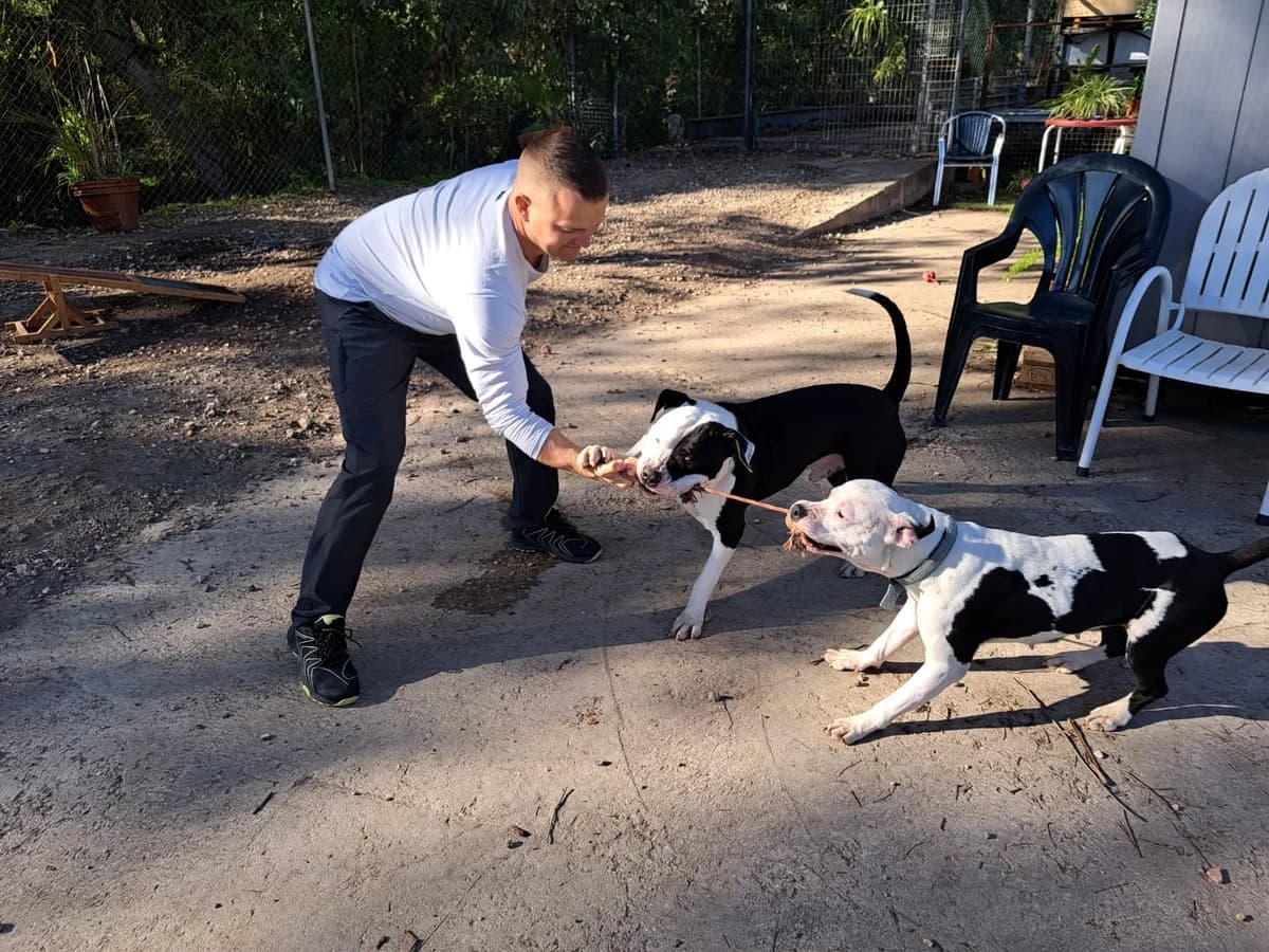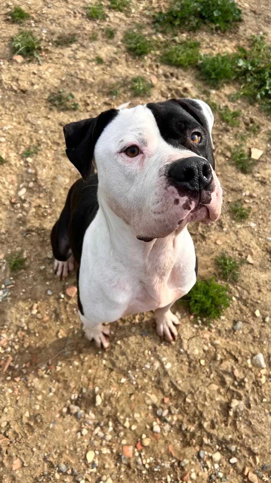 Clyde is a beautiful bully mix with strong presence who needs an experienced family that understands breed perceptions. He's cuddly and affectionate, giving slobby kisses, but his weight and enthusiasm can intimidate people. Found running roadside with his companion Bonnie, he walks well on leash in nature but needs patience in urban environments. He loves mud puddles, rope pulling, and human contact, concentrating well especially with treats. Very friendly and active, seeking his forever home. He's leishmania positive but controlled, with minor past skin effects on ears.