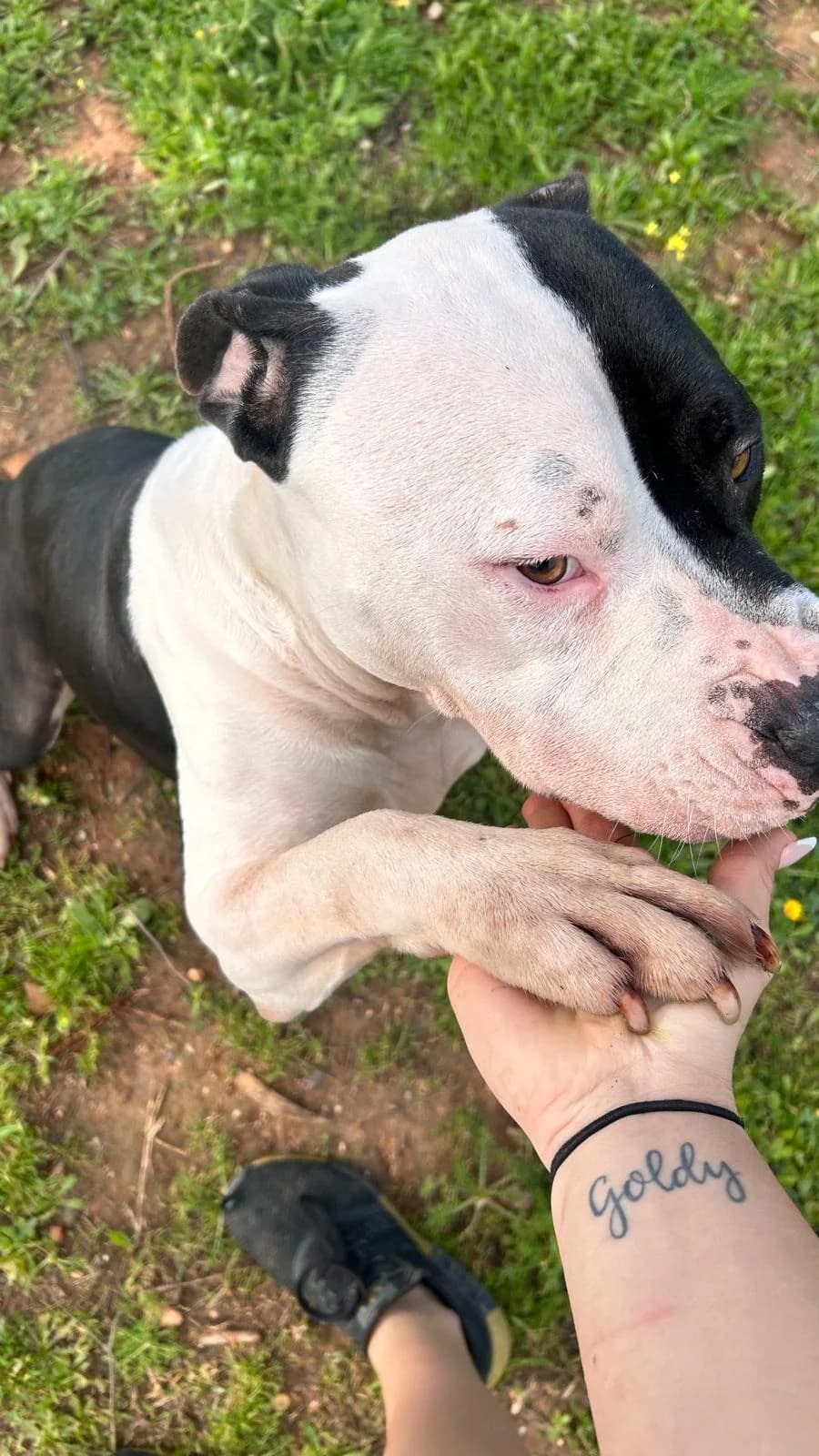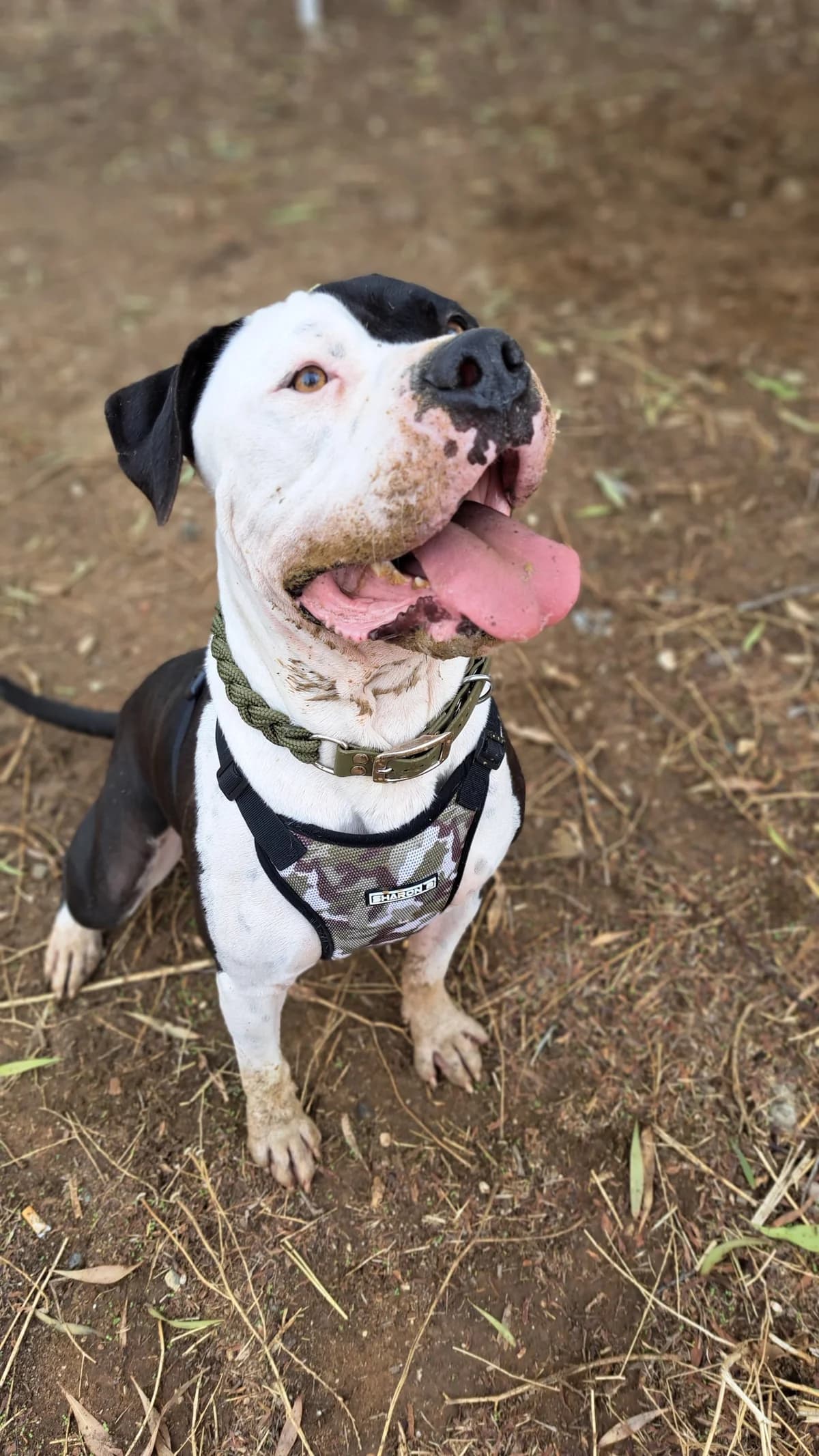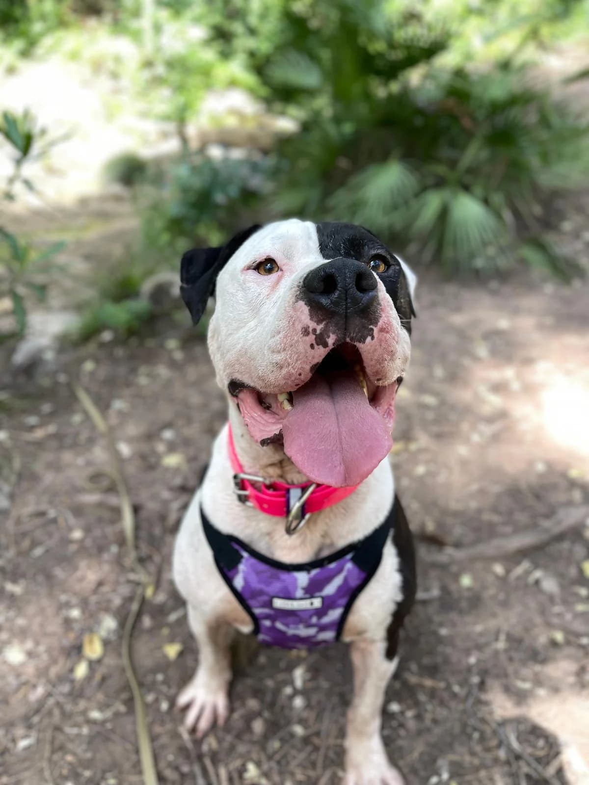 Clyde is a beautiful bully mix with strong presence who needs an experienced family that understands breed perceptions. He's cuddly and affectionate, giving slobby kisses, but his weight and enthusiasm can intimidate people. Found running roadside with his companion Bonnie, he walks well on leash in nature but needs patience in urban environments. He loves mud puddles, rope pulling, and human contact, concentrating well especially with treats. Very friendly and active, seeking his forever home. He's leishmania positive but controlled, with minor past skin effects on ears.