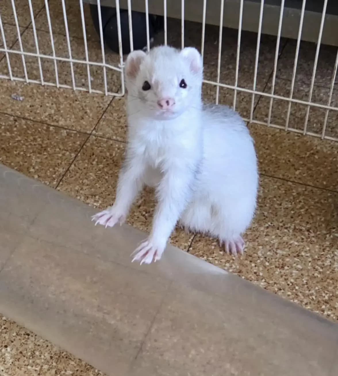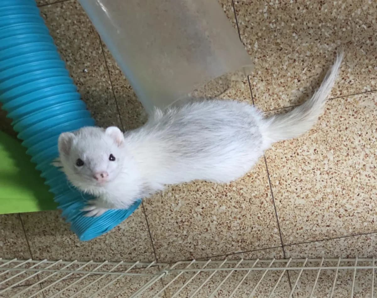 Fidji est un mâle silver white black eye âgé de 2 ans, un déménagement est la cause de son abandon. Fidji est propre et sociable. il est vacciné, pucé et stérilisé Fidji a été adopté le 8 janvier 2026 et rejoint une femelle âgée de 4 ans. Entre temps au refuge , il était devenu hyper sociable avec ses congénères et avec nous , un amour de furet