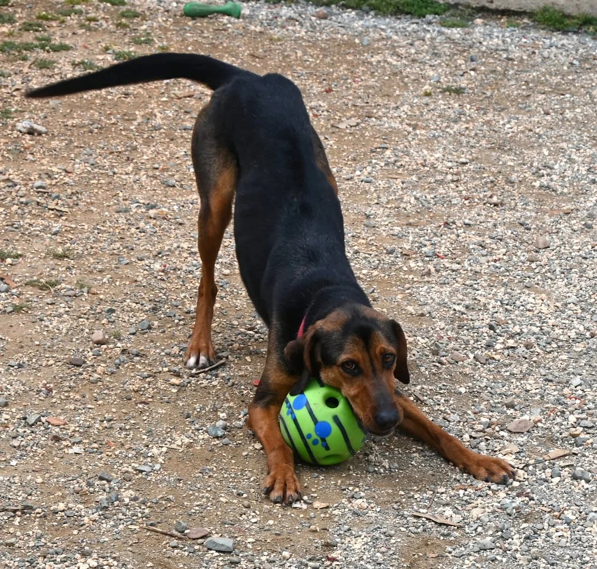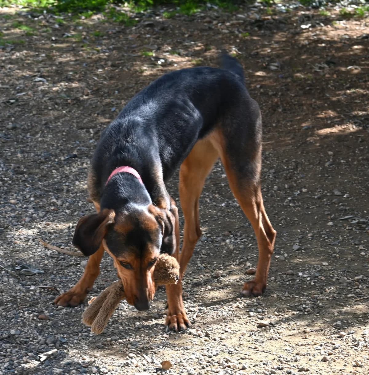Frankie came to us along with her friend Twizel when the pound that they were in was closed down. She’s a such a pretty girl and definitely looks like she may be a Greek Harehound cross and if you see her “killing” a soft-toy you can see that she’s a hunter. Frankie is loving and friendly and always greets us with a waggy tail. She loves a cuddle and has a sweet, gentle temperament. This pretty, long-legged girl mostly goes out to play with her friend Twizel. They came to us as a pair and initially shared a kennel. But she is also good with other dogs and we believe that, with the right introductions, she could join a home with another resident dog. Frankie is curious, clever and eager to please. We think that she’d respond well to training. She’s also playful and active so will enjoy long walks and mental stimulation. Frankie came to us along with her friend Twizel when the pound that they were in was closed down. She’s a such a pretty girl and definitely looks like she may be a Greek Harehound cross and if you see her “killing” a soft-toy you can see that she’s a hunter.