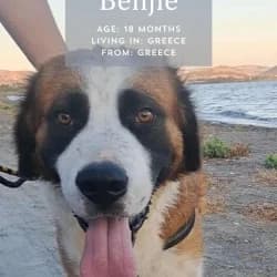 Benji is officially a cuddle-monster who loves people, despite all the terrible hardship he has endured. Found abandoned and abused on the streets in Greece, Benji was in a horrific state when we were asked to support his rescue last year. We have been sponsoring him ever since and in that time he has gained weight and is now fit and well. He is negative for all blood borne diseases including Brucellosis. Benji is friendly with other dogs and doesn't bother with cats so could live in a multi pet home with careful introductions. He will however need feeding separately as he was starved. As you can see from his video, Benji adores people and loves nothing better than cuddles and affection! He can live with children aged 14 and above. He will need to be neutered when he reaches maturity (neutering will be a condition of his adoption). Watch his video - we challenge you not to smile! And please reach out to us about beautiful Benji (spelt with and without an “e”😊)