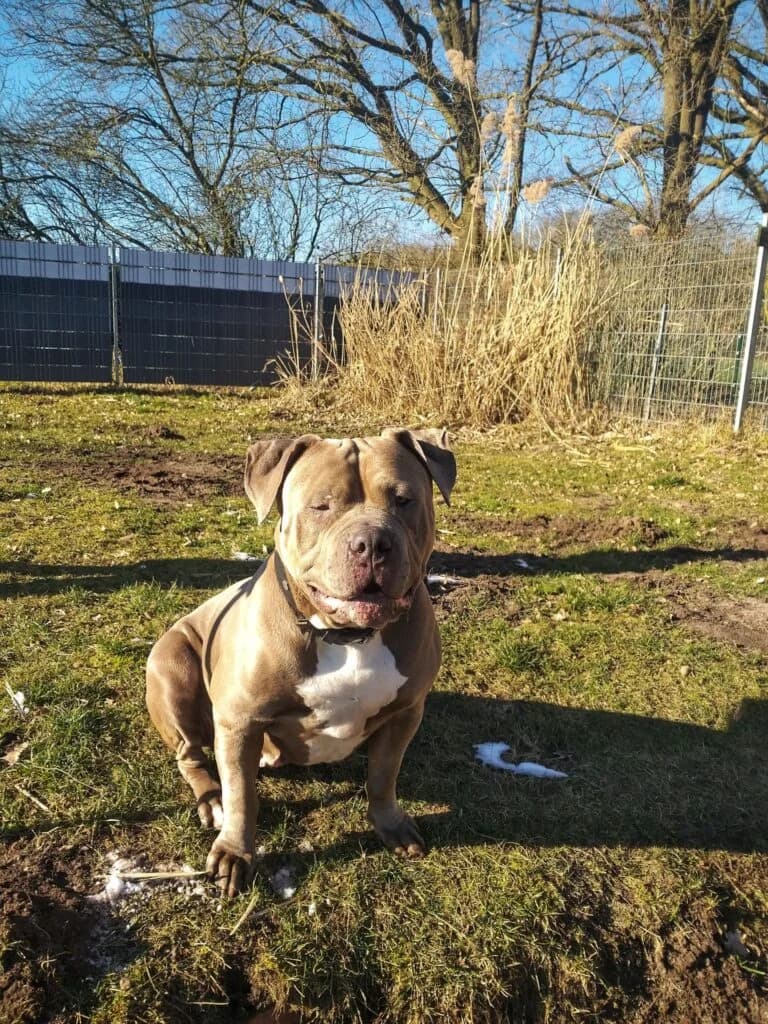 Es gibt Hunde, die berühren einen im ersten Moment – nicht wegen ihrer Statur, sondern wegen ihres Blickes. Unsere Kimba ist genau so eine Seele. Mit ihren fast 6 Jahren ist die wunderschöne American Bully XL Hündin (inzwischen kastriert) eigentlich im besten Alter, um die Welt zu entdecken. Doch Kimbas Geschichte ist keine leichte. Ein Herz aus Gold in einem Körper, der Hilfe braucht. Kimba liebt Menschen über alles. Egal ob groß oder klein, sie geht offen auf jeden zu und möchte am liebsten in den Schoß krabbeln – auch wenn sie dabei vergisst, dass sie stolze 47 kg auf die Waage bringt. Sie ist eine absolute Kuschelbärin, die nichts mehr will, als endlich 'anzukommen' und geliebt zu werden. Ehrliche Worte: Kimbas Rucksack ist schwer. Wir wollen nichts beschönigen: Kimba ist ein Opfer ihrer Rassegeschichte, einer sogenannten Qualzucht. Ihre Genetik hat ihr viele Steine in den Weg gelegt. Von Arthrose über Rolllider bis hin zu Kreuzbandrissen und extremen Belastungen der Ellenbogen durch ihren schweren Vorderbau – Kimba wird leider immer eine 'Baustelle' bleiben. Was wir für sie tun – und was ihr neues Zuhause leisten muss: Aktuell bekommt Kimba das volle Wohlfühlprogramm, damit sie schmerzfrei durch den Alltag gehen kann: -Regelmäßige Physiotherapie: Damit die Muskeln die Gelenke stützen. -Hochwertige Nahrungsergänzung: Um Entzündungen im Zaum zu halten. -Medizinische Betreuung: Wir haben bereits Gangbildanalysen und Operationen hinter uns, um ihr Lebensqualität zu schenken. Ihr perfektes Zuhause: Kimba sucht ein ganz besonderes Nest. Da sie in der Vergangenheit Probleme mit Artgenossen hatte und Katzen absolut nicht mag, wird sie nur als Einzelprinzessin vermittelt. Sie möchte ihre Menschen für sich allein haben. Unsere Voraussetzungen für ein Happy End: Erfahrung: Du solltest dich mit dieser Rasserichtung auskennen. Ebenerdiges Wohnen: Bei 45 kg und Gelenkproblemen sind Treppen ein Tabu. Finanzielle Stabilität: Physio und Medikamente werden sie ihr Le