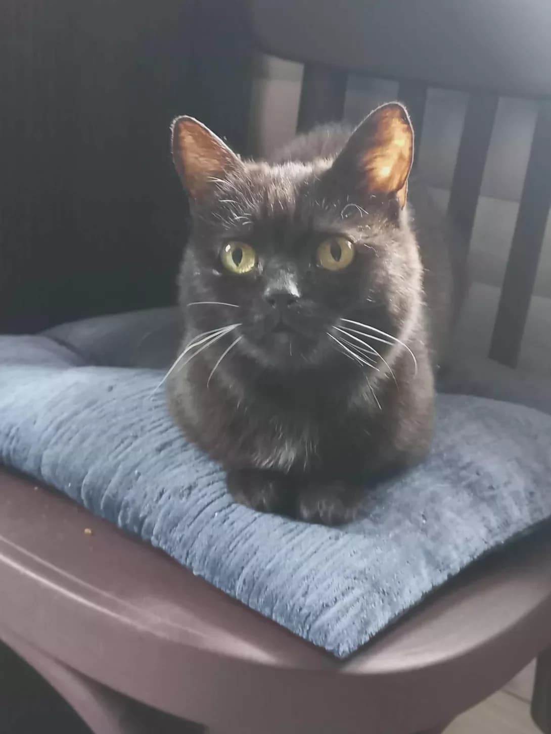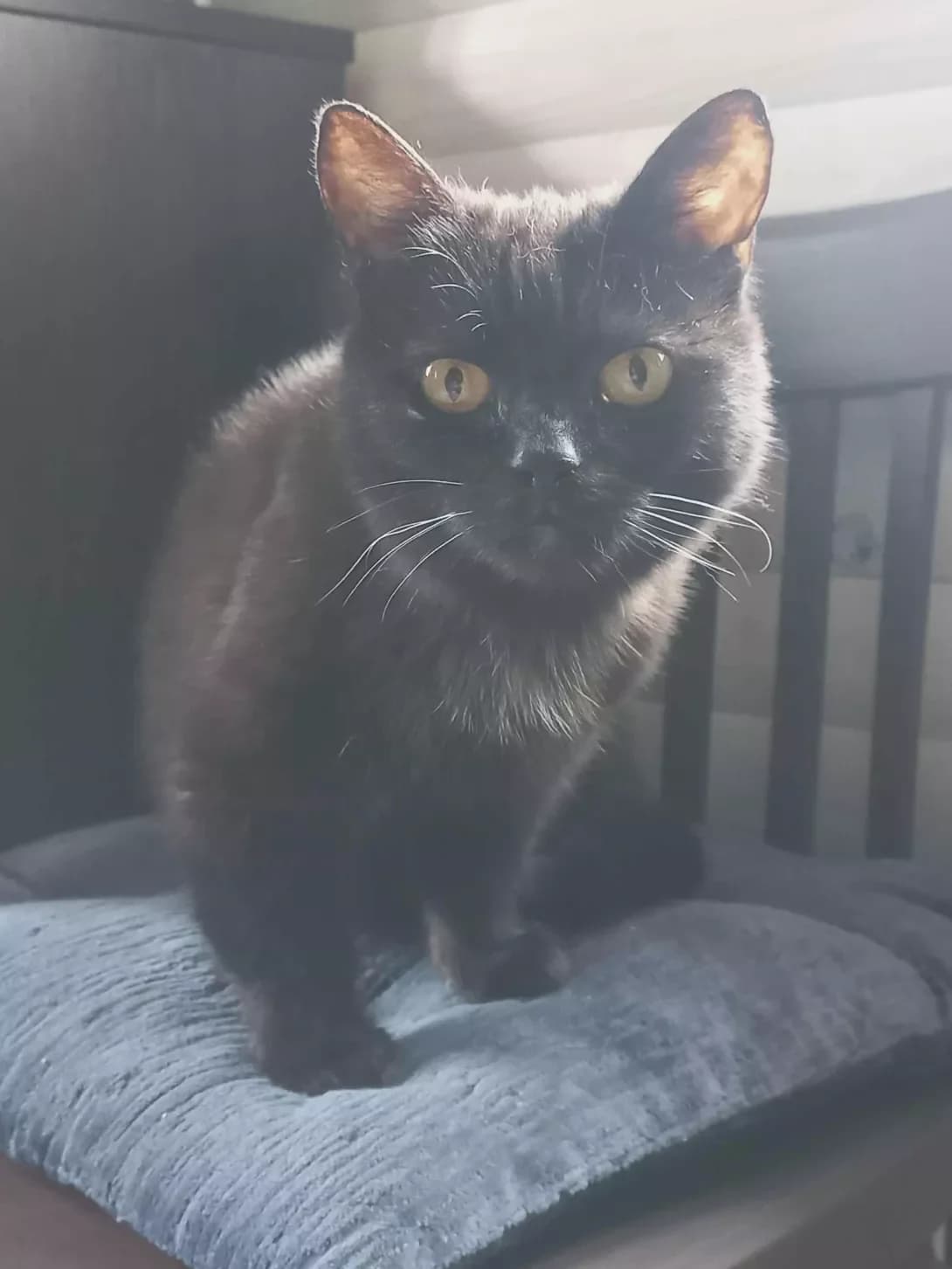 Маленька та тендітна красуня. Чорна, на пузьку біла плямка, білі вуса. Дуже любить увагу та ласку, лежати на ручках та муркотіти. Не дуже ладить з іншими тваринами.