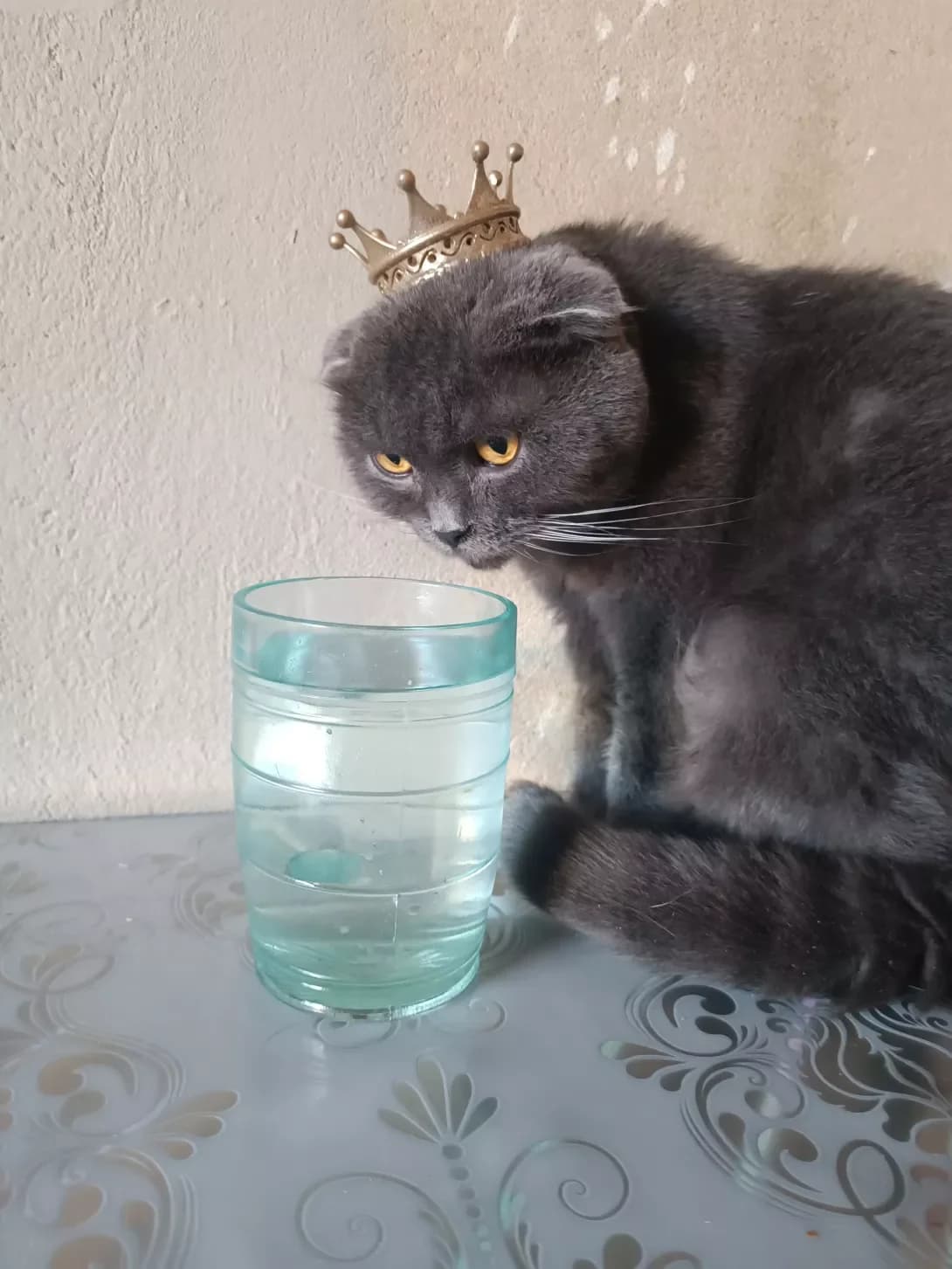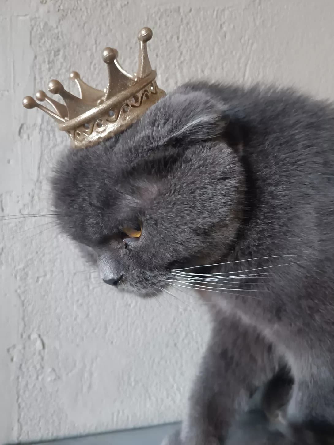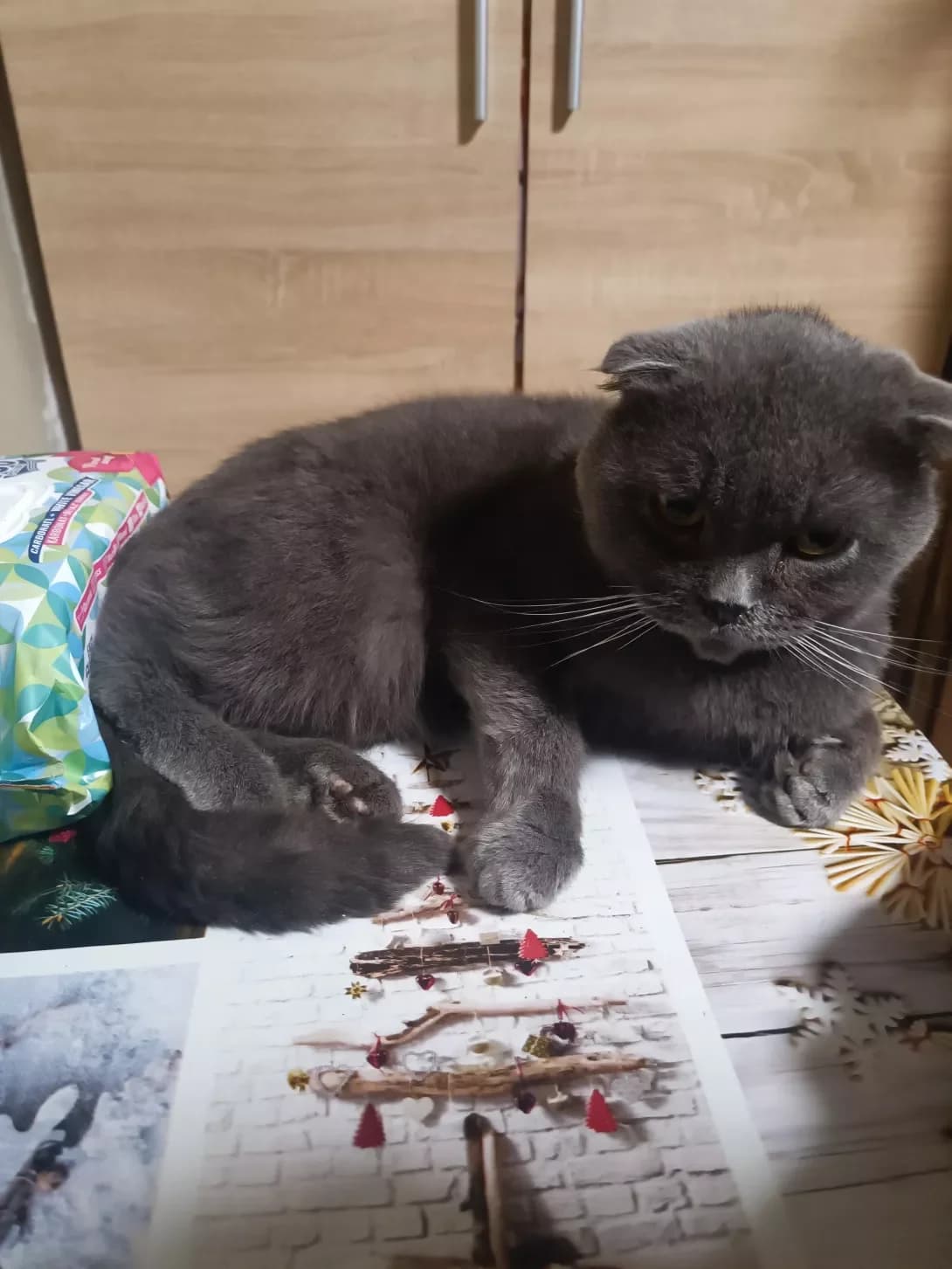 Scottish Fold. Approximately 6 years old. Had some health problems, was euthanized. Doctors cured him, no problems. Needs periodic tests. For peace of mind. Eats Royal Fit 32. The tray is excellent. Neutered. Found a common language in the team.