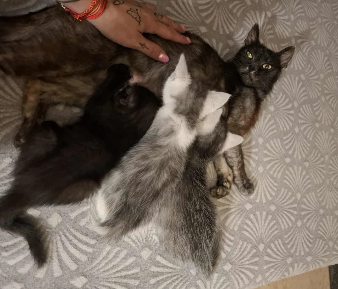 Léna szintén mamacica még, de pár hét múlva már gazdikereső lesz. Ő is egy igazi küzdő, mielőtt hozzánk került, a „gazdája” nemtörődömsége miatt a túlélésre játszott, utcán kuncsorogta az ételt, bolhásan, férgesen, a végén már csontsoványan. Szerencséjére egy gyakran arra járó hölgy és kislánya megsajnálta, általa került a gondozásunkba, ahol azonnal császározni kellett, így menekült meg az egész kis család. Léna egészségi állapota is ingadozó volt kezdetben, hiszen nagyon legyengülve érkezett valami vírusos fertőzéssel és 4 picurkát kellett nevelnie... Sajnos egy picit 5 hetesen elveszítettünk. Mára mindenki jól van, a kölykök 7 hetesek és igazi kis eleven, játékos szőrgombócok. A picik 9 hetes koruk után gazdihoz költözhetnek majd és utána Lénának is szeretnénk egy szuper családot találni, ahol megbecsülik, lakásban, biztonságban élhet és többet nem kell éheznie! :16:24)