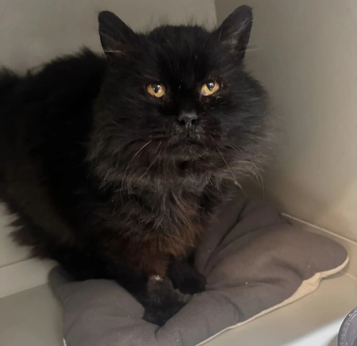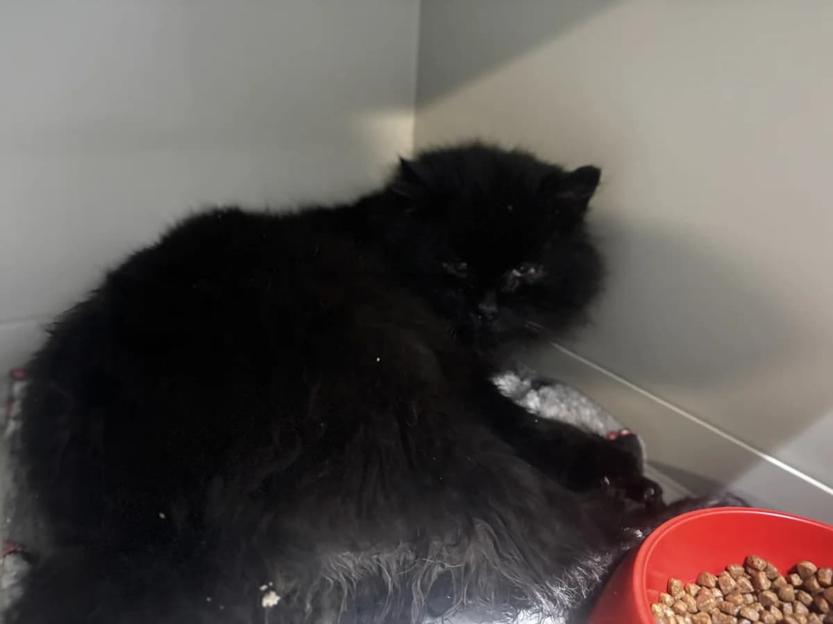 Černý dlouhosrstý kocour, který k nám přišel se zánětem očí. Čekalo ho vyšetření a má léčbu. Je velmi kontaktní a mazliví :) Brzy přineseme více info.