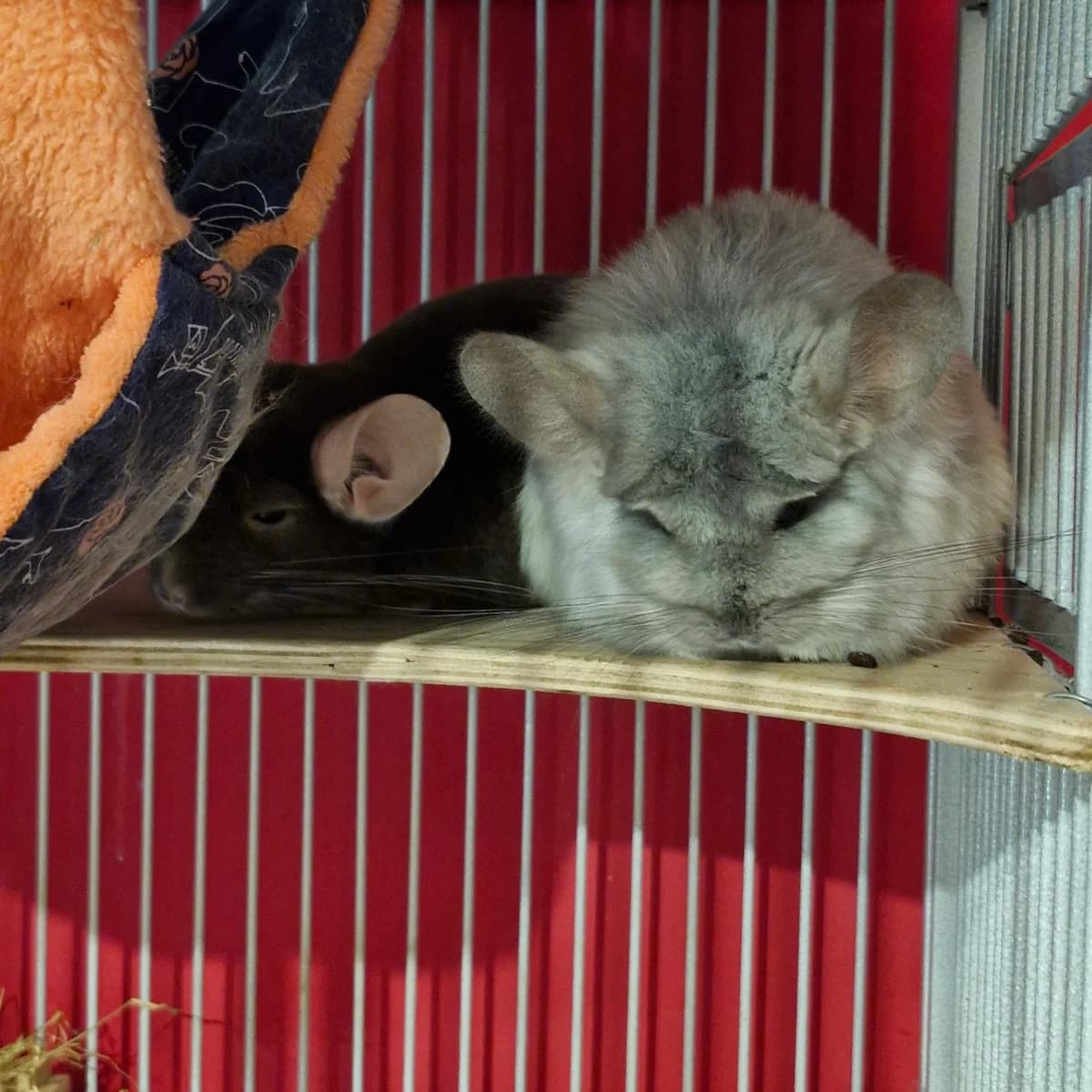 Adoption en duo Mira (angora grise) et Indy (chocolat )sont deux adorables femelles chinchillas récupérées suite a une cession d’activité d’un éleveur. Toutes les deux sont très complices et inséparables. Elles partagent leurs moments de jeu, leurs siestes blotties l’une contre l’autre et leurs explorations avec une belle harmonie. Leur entente est un vrai bonheur à observer : elles s’apaisent mutuellement et montrent une grande douceur l’une envers l’autre. Il est cependant essentiel de rappeler qu’un chinchilla n’est pas un animal comme les autres et qu’il a des besoins bien spécifiques. Ces petits rongeurs doivent vivre dans un environnement adapté. Leur alimentation doit être strictement adaptée aussi Les chinchillas sont aussi des animaux actifs, surtout en soirée, qui nécessitent un espace suffisant pour sauter, grimper et se dépenser. Une cage adaptée, enrichie de plateformes et de cachettes, est indispensable à leur bien-être. Enfin, ils demandent du calme, de la patience et une manipulation douce, car ils peuvent être stressés facilement. Mira et Indy ne sont donc pas seulement deux petites boules de poils attachantes : elles sont aussi des compagnons qui nécessitent une attention particulière et des soins adaptés, pour vivre heureuses et en pleine santé.