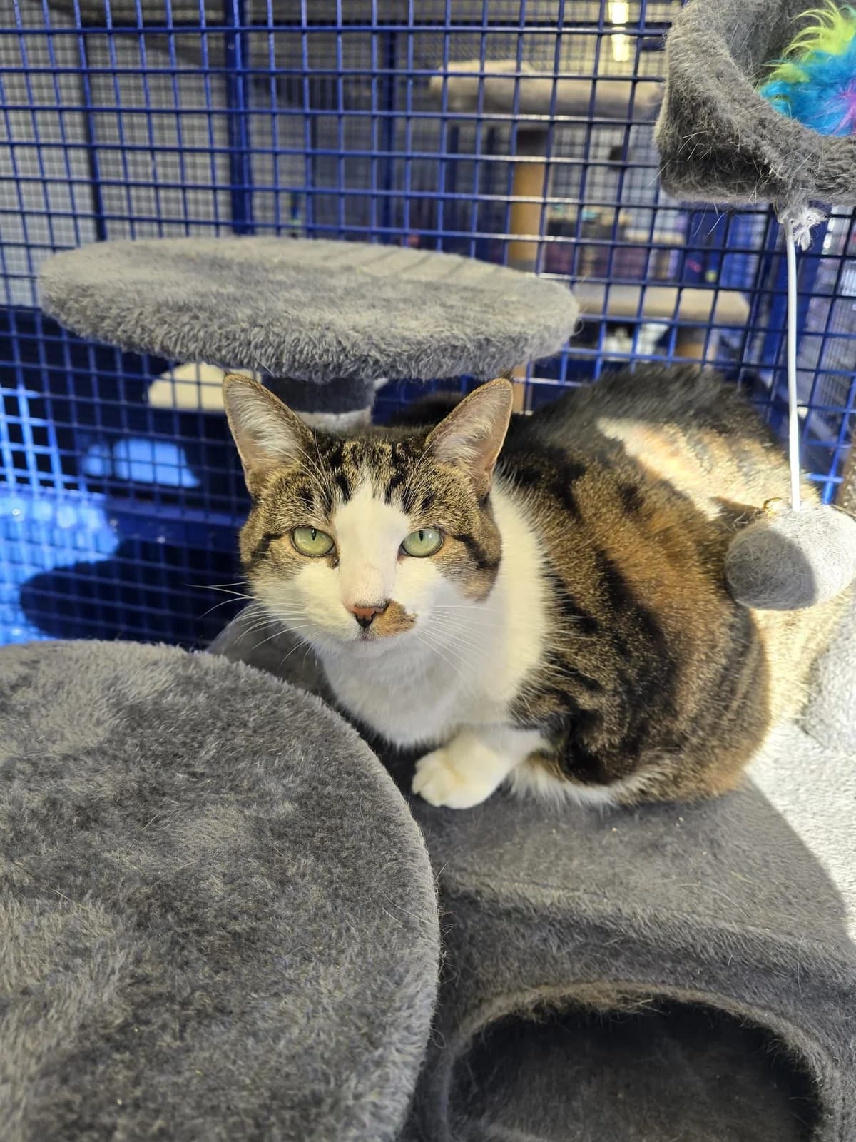 Misty Male aged around 7 Neutered, vaccinated and microchipped. Lovely Misty is an affectionate boy looking for his new home. He’s a big hunk of love and would need his weight monitored. He lives to hang out in his cat tree and watch all the goings on but would love you be lying on your sofa instead. We don’t know how he is with other cats but doesn’t seem bothered by the cats near him. We don’t know how he is with dogs. We think he would be fine with cat savvy children. Could you offer this boy a home? If so please apply via the website! Thank you.