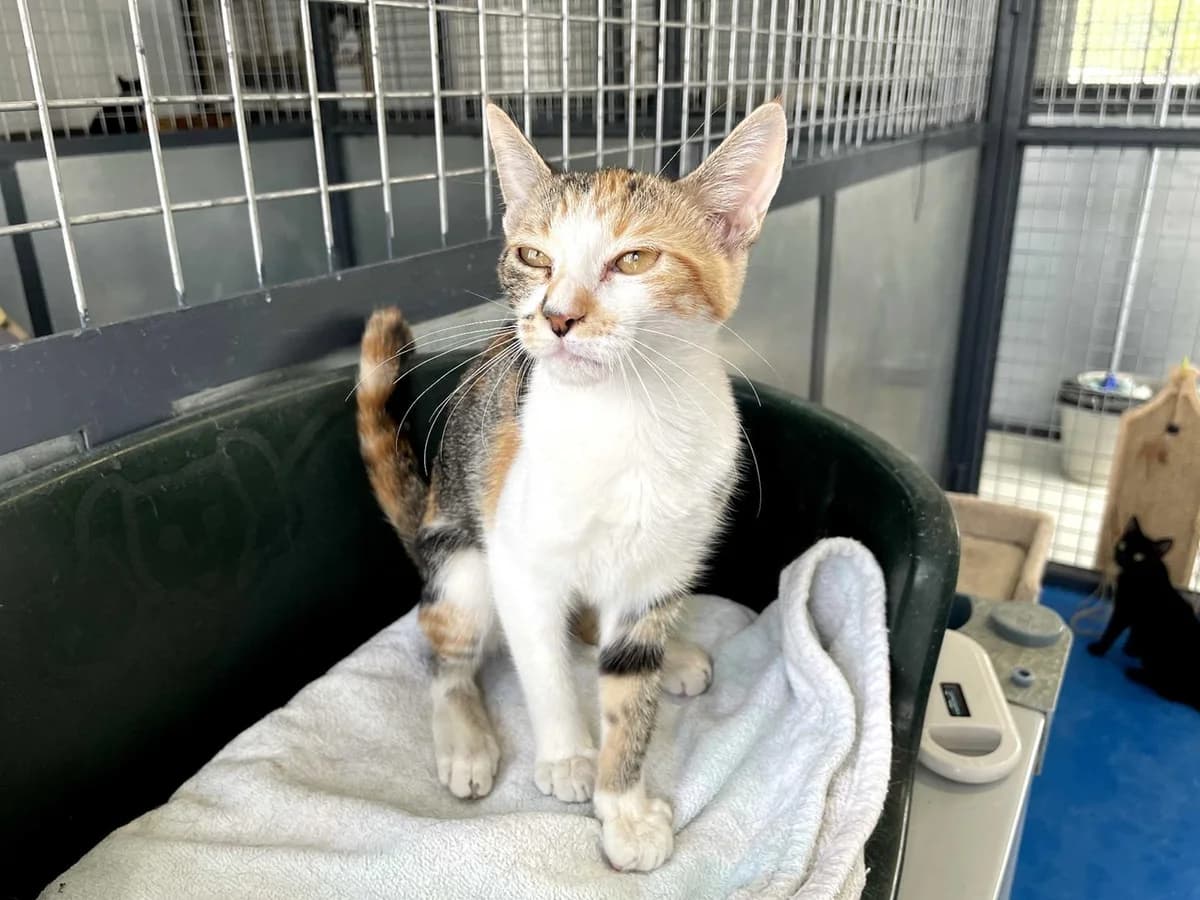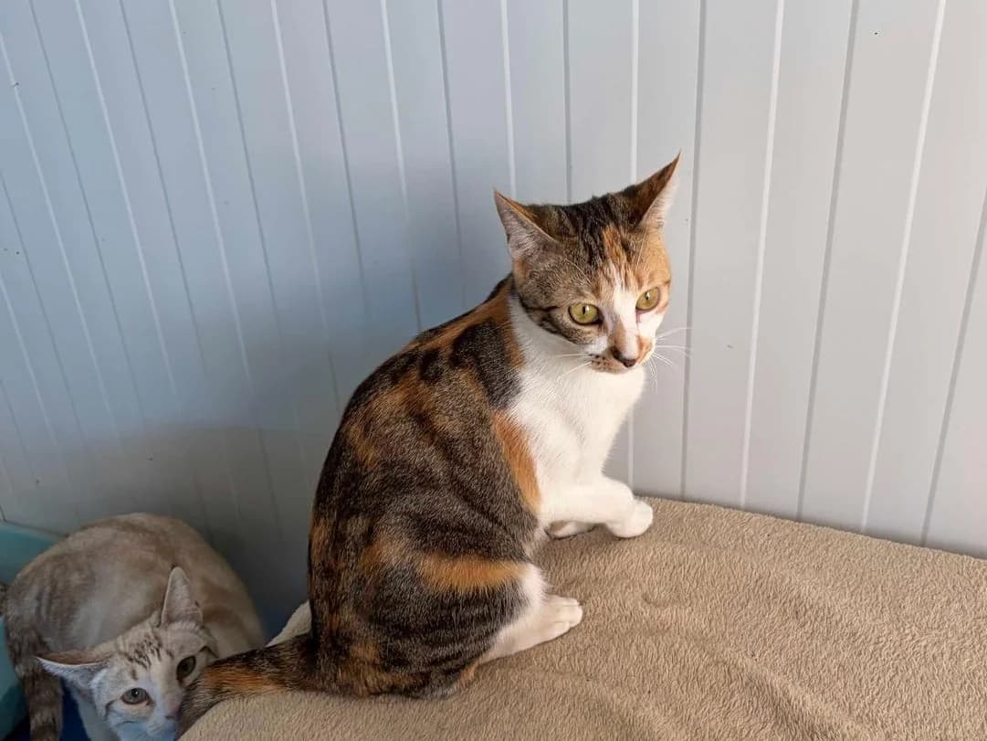 Moxie is a beautiful calico kitten rescued from Marbella at two months old. Initially reserved and grumpy with strong personal space needs, she has gradually warmed up through patience and love. She now lives with other kittens and has learned to enjoy petting, though sometimes gives gentle nips as she's still learning. Moxie needs an experienced cat family without children who can provide patience and understanding to help her fully open her heart. She's looking for a home where she can learn the true meaning of belonging.