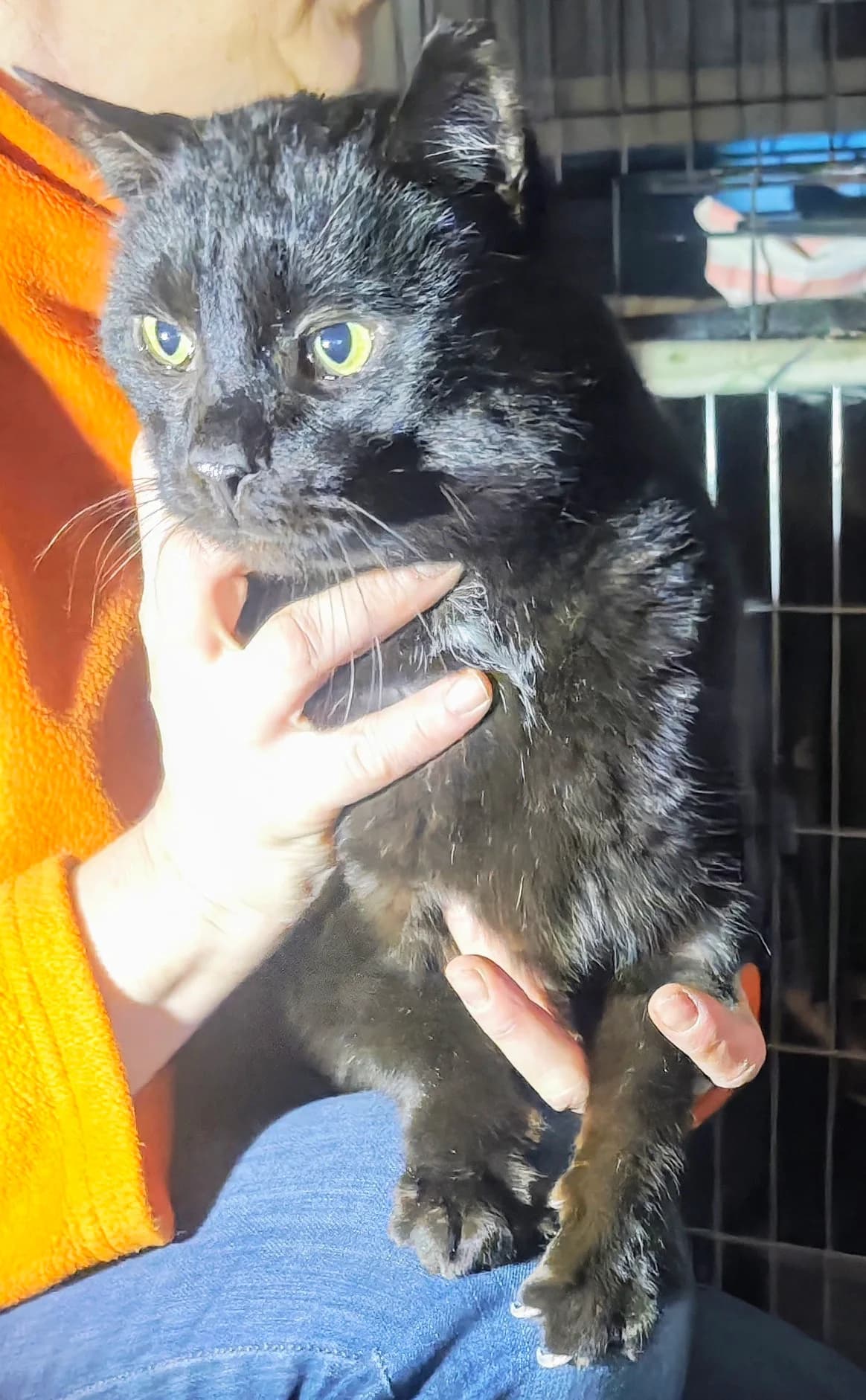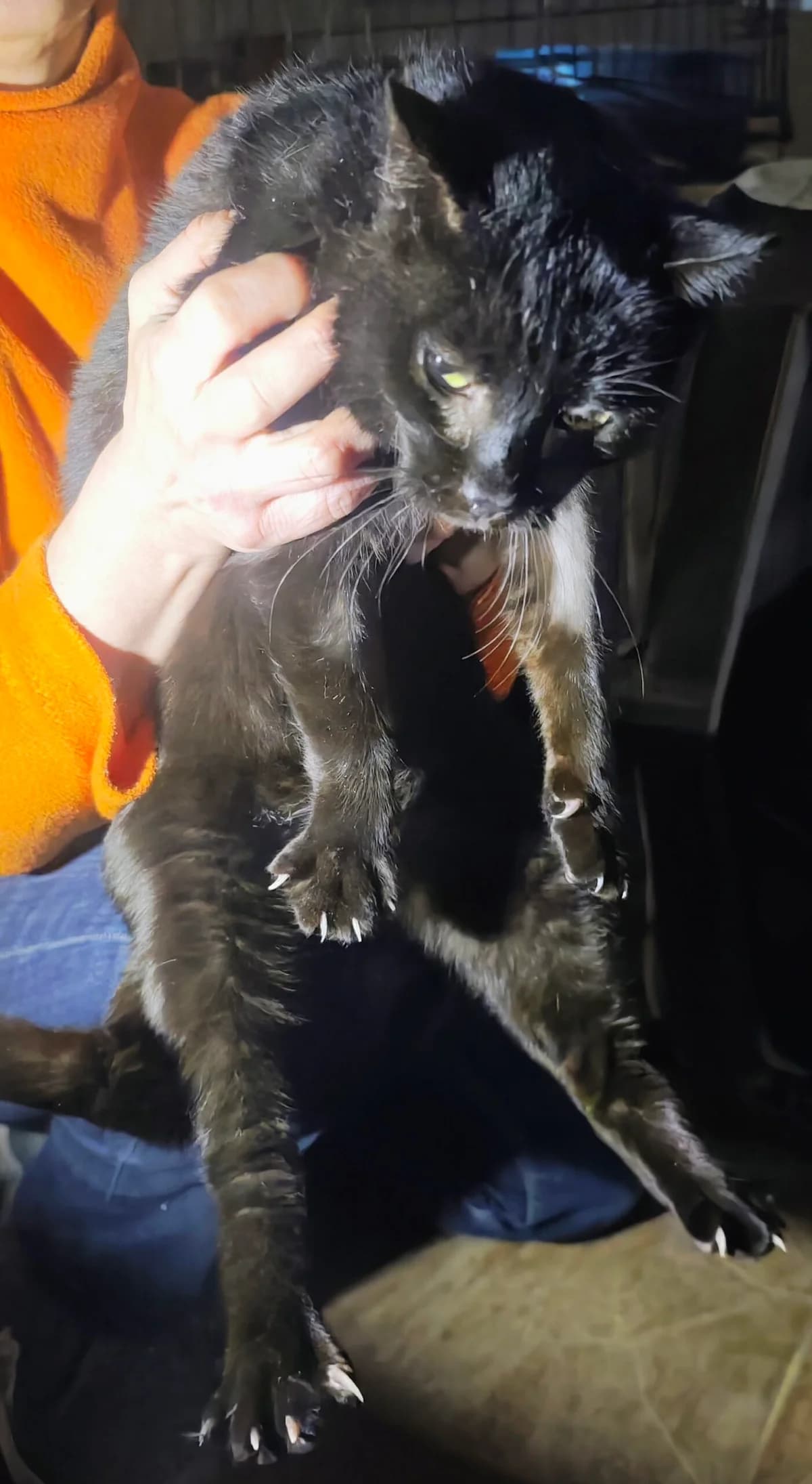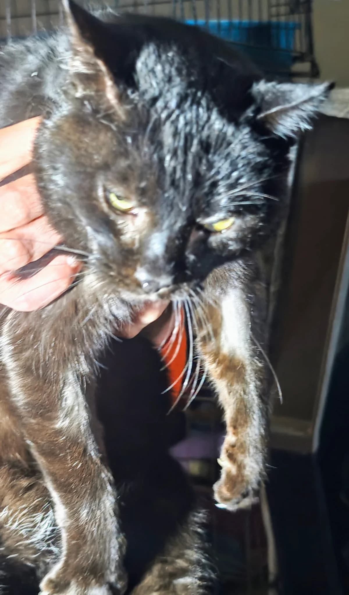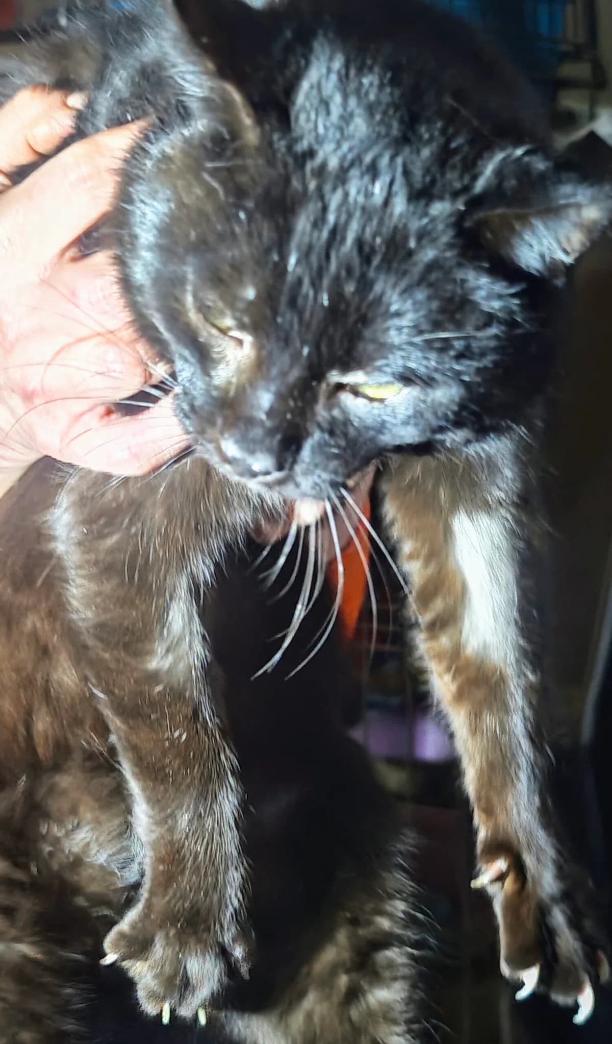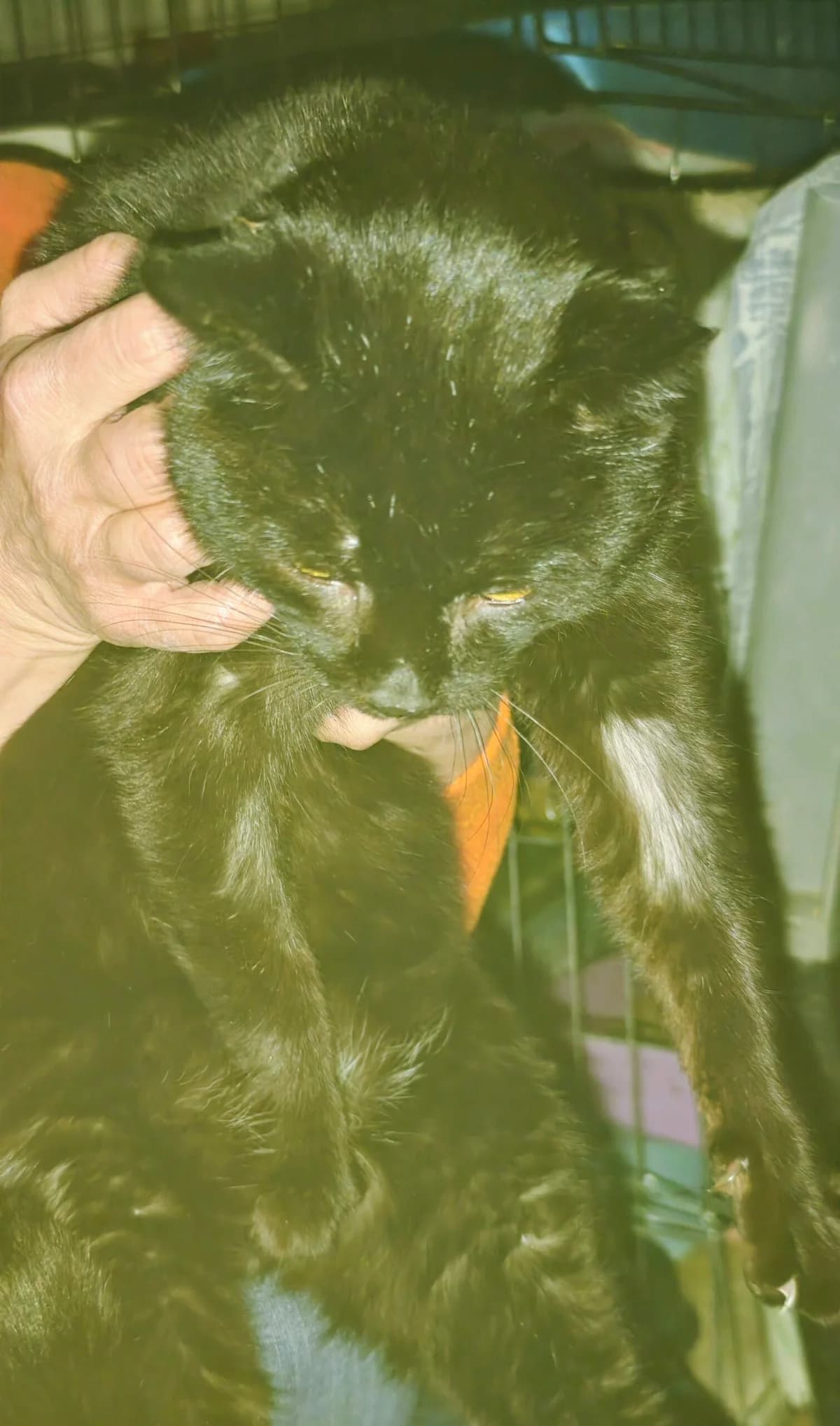 The cat after the procedure to remove growths from the ear. Age? Unfortunately, the growth grows back again – there are suspicions of cancer. He needs a home that's willing to take in a hospital cat for the rest of his days. Nice talk. With very little chance of home.Because whoever wants a regular black cat with awareness of it may be a fatal illness.