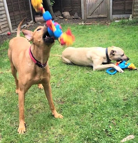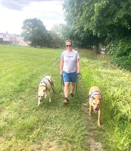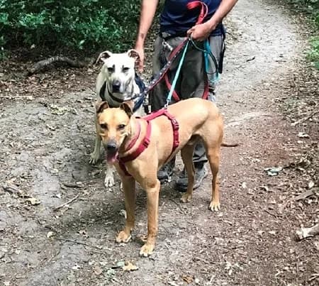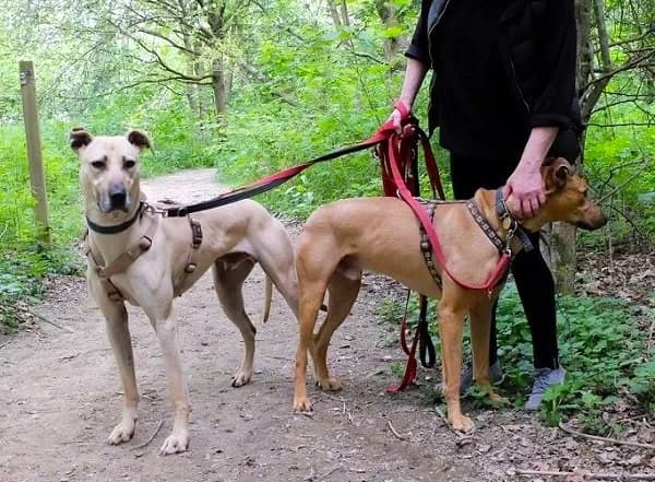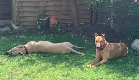 Please help Yogie and Scoobie by sharing this page! Lovely Lurcher brothers, Yogie and Scoobie, are 10-years-old and looking for a retirement home together. They're in the care of Rescue Remedies near Gatwick, on the Surrey/West Sussex border. Scoobie and Yogie could live with older, dog savvy children. They can't live with cats and it's unknown whether they could live with other dogs. Yogie is now muzzled when outside on walks as he recently had a naughty moment and caught the leg of a cat when he was on lead. One of the volunteer dog walkers at Rescue Remedies said, "Yogie was easy to harness and was willing to trust me to leave his beloved brother to head into the muddy woods. We enjoyed a lovely gentle walk, skirting around the worst of the mud. We had a few pauses for some reassuring strokes but Yogie was willing to continue despite the fact we were mostly walking alone today. "Yogie is far more timid when without Scoobie who clearly increases his confidence. For a brief section, to avoid another reactive dog, we took a little detour into the open grassland where of course the wildlife smells got the better of Yogie and he couldn’t resist a little roll in the grass. Just as I thought Yogie was ready to turn around and head back, he seemed to select a wilder path further into the woods. Soon after our deviation from the main track we then had a couple of horses with their riders gallop by on the main path we had been walking. "Having returned to main path for our return we crossed paths with a cyclist with a medium sized, off-lead dog. We directed ourselves slightly off the path into the trees slightly, Yogie was happy for them to pass nearby without any fuss or noise. Not too much further on I was reminded that Yogie isn’t always reactive but can still be upset by some dogs; as we crossed paths (head on) with another bigger muzzled dog who gave off more confrontational vibes warranting some barking a slight lunging (Yogie is reasonably slight so this is not too difficult to deal with). Given that Yogie was merely voicing his worries, it was easy to carry on past (Yogie preferred to leave the situation) when there was sufficient space to do so. Yogie was happy to get home to Scoobie and to receive a few treats while I prepared his brother to leave his walk. "This gorgeous pair are such a lovely walk with mainly loose leads. Yogie will sometimes get excited when scenting wildlife and can be dog reactive if in a confrontational situation (and should be kept away from cats) but he’s a lovely sweet, gentle, soft and loving boy who knows how to show off his skills for treats. A pleasure to be around! I do hope the right people come forward for this wonderful bonded pair." Their occasional respite foster carer said, "They are experts at giving cuddles and seem to think they are lap dogs despite their size. They are also lounging lurchers. There’s always a race to get a spot on the sofa (which Scoobie tends to win), but they are very good natured about making room." These adorable boys are clean in the house and good in the car. If you want to enquire about them, please contact Rescue Remedies as follows: Please read and follow the links in the Rescue Remedies rehoming process here. Please note that Rescue Remedies has a policy of all adopters committing to keep adopted dogs on the lead at all times when out and about. Please say you saw Scoobie & Yogie on the Oldies Club website. This replaces Scoobie & Yogie's previous page dated 10 December 2023.