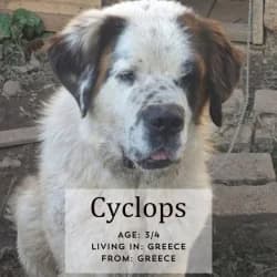 Beautiful boy Cyclops is named (because of his stunning half mask) after the giant-shepherd in Greek mythology.Unlike his mythological namesake, Cyclops is fully sighted and does not eat humans! He is simply a glorious boy who has suffered too much and deserves a forever home. Cyclops was found wandering the Greek roads in a dreadful state of neglect; underweight and suffering from heartworm. The wonderful man who saved him man nursed him back to health. His heartworm has now been successfully treated and Cyclops is a healthy, happy giant, looking for the love of a family. Around 3-4 years old , Cyclops is currently living 60 miles from Athens but is ready to travel to the UK and is very friendly to people and other dogs. As we don't have a child history, sadly we cannot home him with with children under 14 yrs. Cyclops would be perfectly suited to an outdoor lifestyle and needs large-breed experienced adopters.