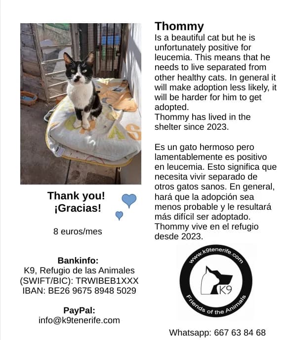 Thommy came to us from the street in 2023, but despite the fact that he is sadly leukaemia positive he had been doing really well. He is friendly and enjoy his food. We hope this continues