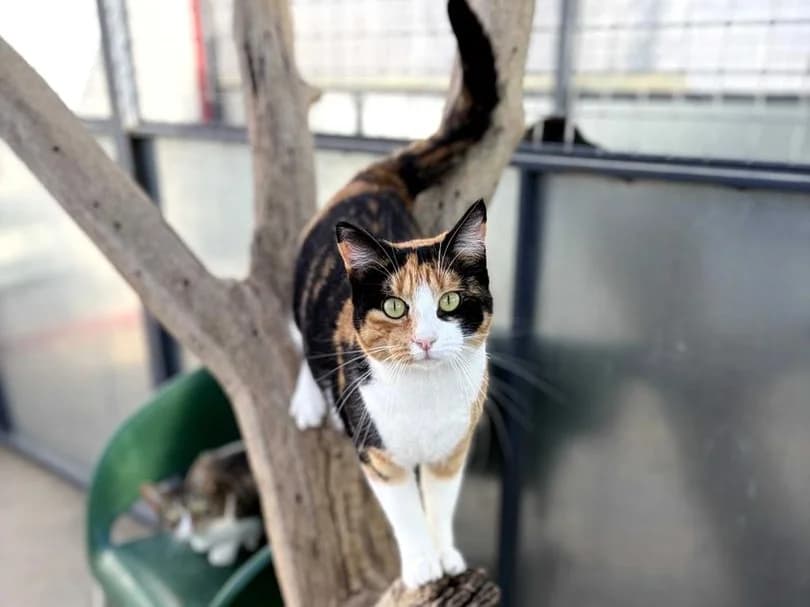 Violeta is a beautiful tricolor cat with gorgeous green eyes, rescued on August 1, 2025. She is affectionate with people, enjoys being petted and human contact, especially in quiet environments. She has a curious and playful nature, loves climbing her scratching post to observe her surroundings from above. Violeta lives harmoniously with other cats and is sociable and respectful in her interactions. She seeks a stable, loving home where she can develop peacefully and share her affection with a family who will love her forever.