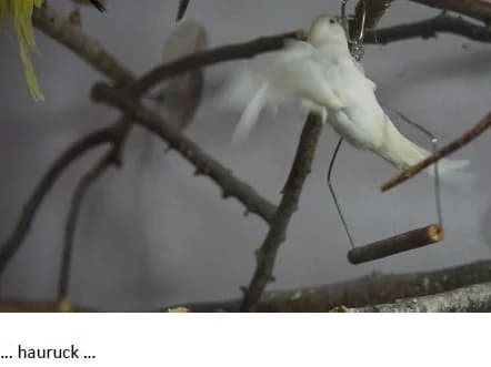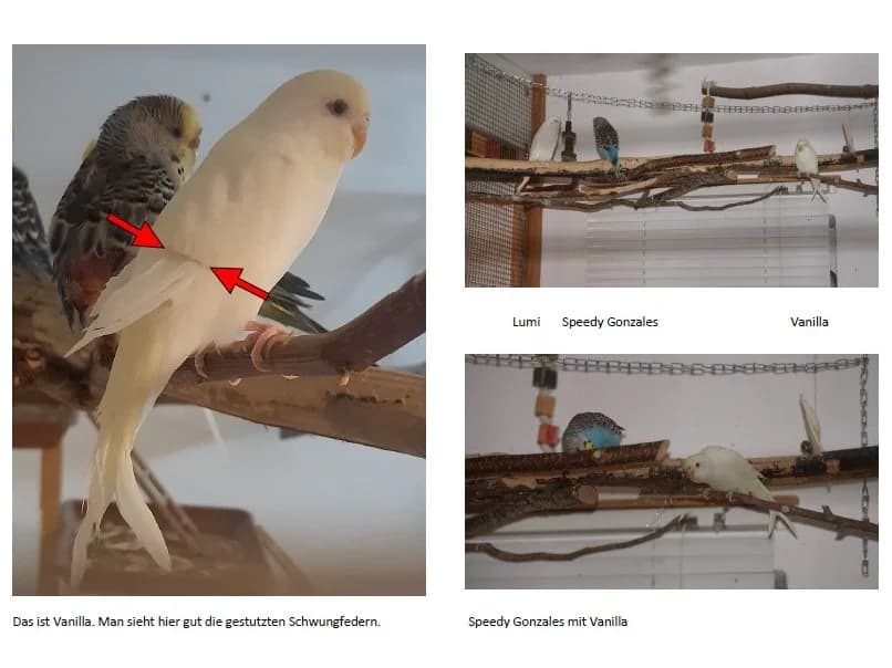 Liebe Frau Heilrath, am 28.01.2023 habe ich bei Ihnen drei Wellensittiche adoptiert. Hier nun mein Bericht über den Stand der Dinge. Nach 1 ½ Wochen Quarantäne im Zimmer meiner Tochter, war ich mit den Dreien zum Eingangscheck in der Vogelklinik. Abgesehen von ihrem Circovirus sind die 3 offensichtlich gesund und in guter Verfassung. Die Tierärztin ist sich allerdings sicher, dass bei zweien die Schwungfedern gestutzt wurden. Auf einem der Fotos kann man es gut erkennen. Wer macht den sowas? Wissen Sie noch weitere Details aus der vorherigen Haltung der drei Piepmätze? Nur so interessehalber. Naja, wie auch immer. Vielleicht wachsen die Federn bei der nächsten Mauser nach. Warten wir es ab. Nun erst mal eine kurze Vorstellung. Ich war nämlich so frei und habe den dreien neue Namen gegeben. Das blaue Männchen bekam, ob seiner Flugunfähigkeit und Lauffreudigkeit, den Namen Speedy Gonzales. Speedy ist ein sehr zurückhaltender Charakter. Lieber erst alles beobachten, abwarten und seine Liebste kraulen. Das gelblich-weiße Mädel erinnert mich an Vanilleeis und bekam deshalb den Namen Vanilla. Sie ist wahnsinnig neugierig, liebt Schaukeln und ist schwer verknallt in Speedy. Das schneeweiße Weibchen wurde Lumi getauft. Das finnische Wort für Schnee. Lumi ist schon eher dominant und lässt sich nix gefallen, hat aber alles im allem ein unaufgeregtes Wesen. Wie eingangs erwähnt, war letztens der Eingangscheck und noch eine Laboruntersuchung des Kots. Am Freitagmittag kam dann der Befund. Die drei sind soweit clean. Also ab in die Voliere. Ich habe einfach mal den Quarantänekäfig in die Voliere gestellt, die Türchen aufgemacht und geschaut was passiert. Vanilla, als die neugierigste und kontaktfreudigste (soll heißen sie quatscht viel), ist bereits nach etwa einer ¼ Stunde aus dem Käfig geklettert. Sie war allerdings so schwer beeindruckt über die wahnsinnige Größe der Voliere (zumindest im Vergleich zu ihrem vorherigen Käfig), dass sie bestimmt 10 Mal zurück in den Käfig und w